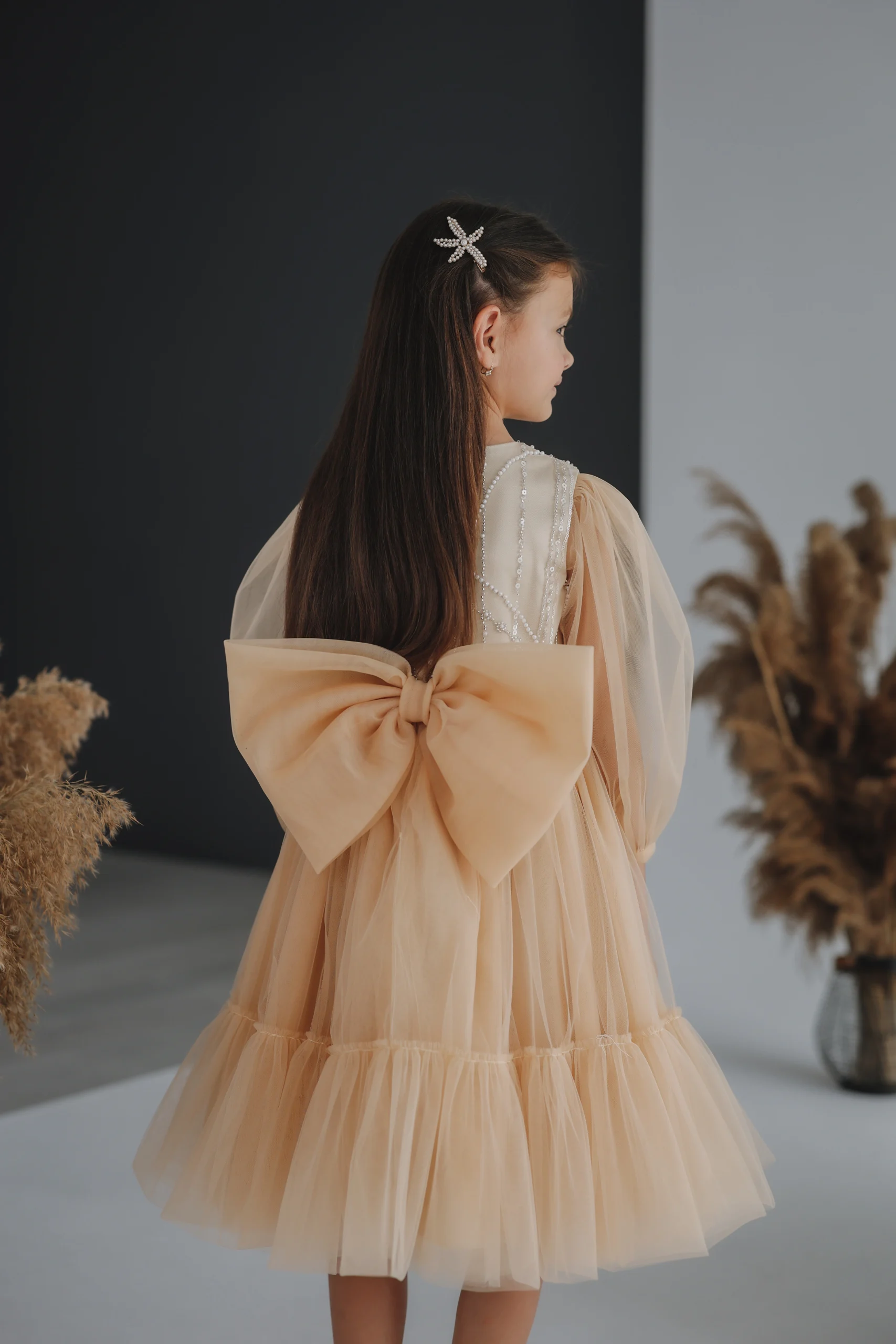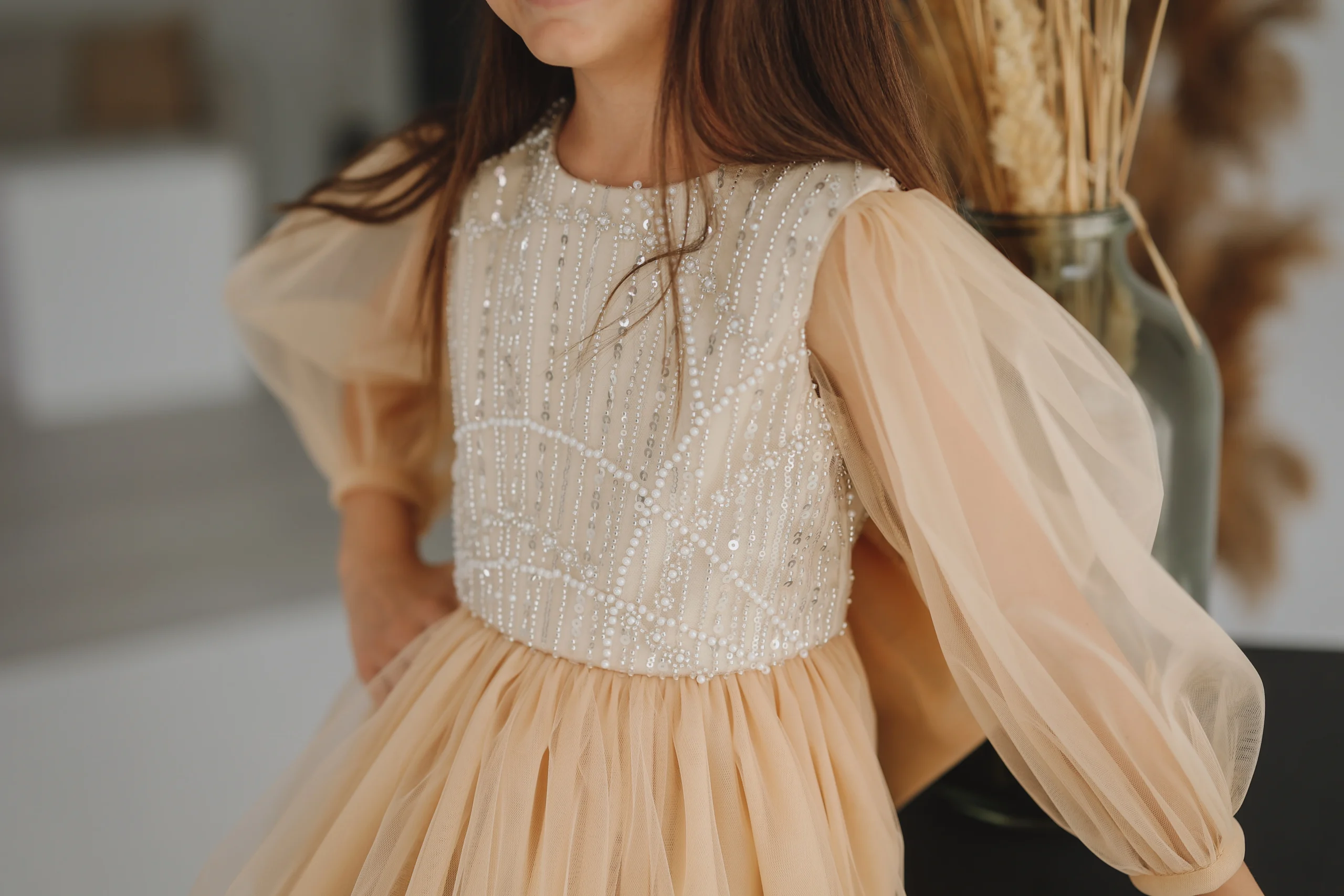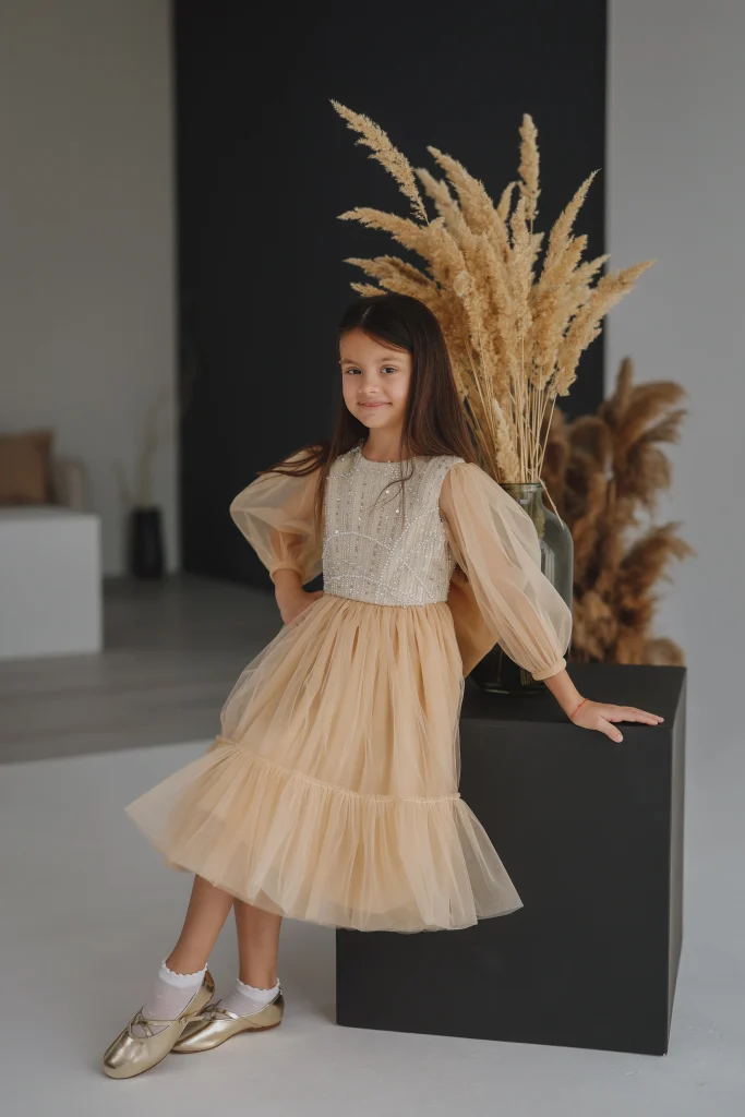 Haljina je izrađena od visokokvalitetnog tila u nežnoj bež boji, sa gornjim delom ukrašenim predivnim srebrnim šljokicama koje dodaju glamurozan sjaj. Puf rukavi od tila doprinose bajkovitom izgledu, dok lepršava suknja omogućava udobnost i slobodu pokreta. Ova haljina je idealan izbor za rođendane, venčanja i svečane proslave.