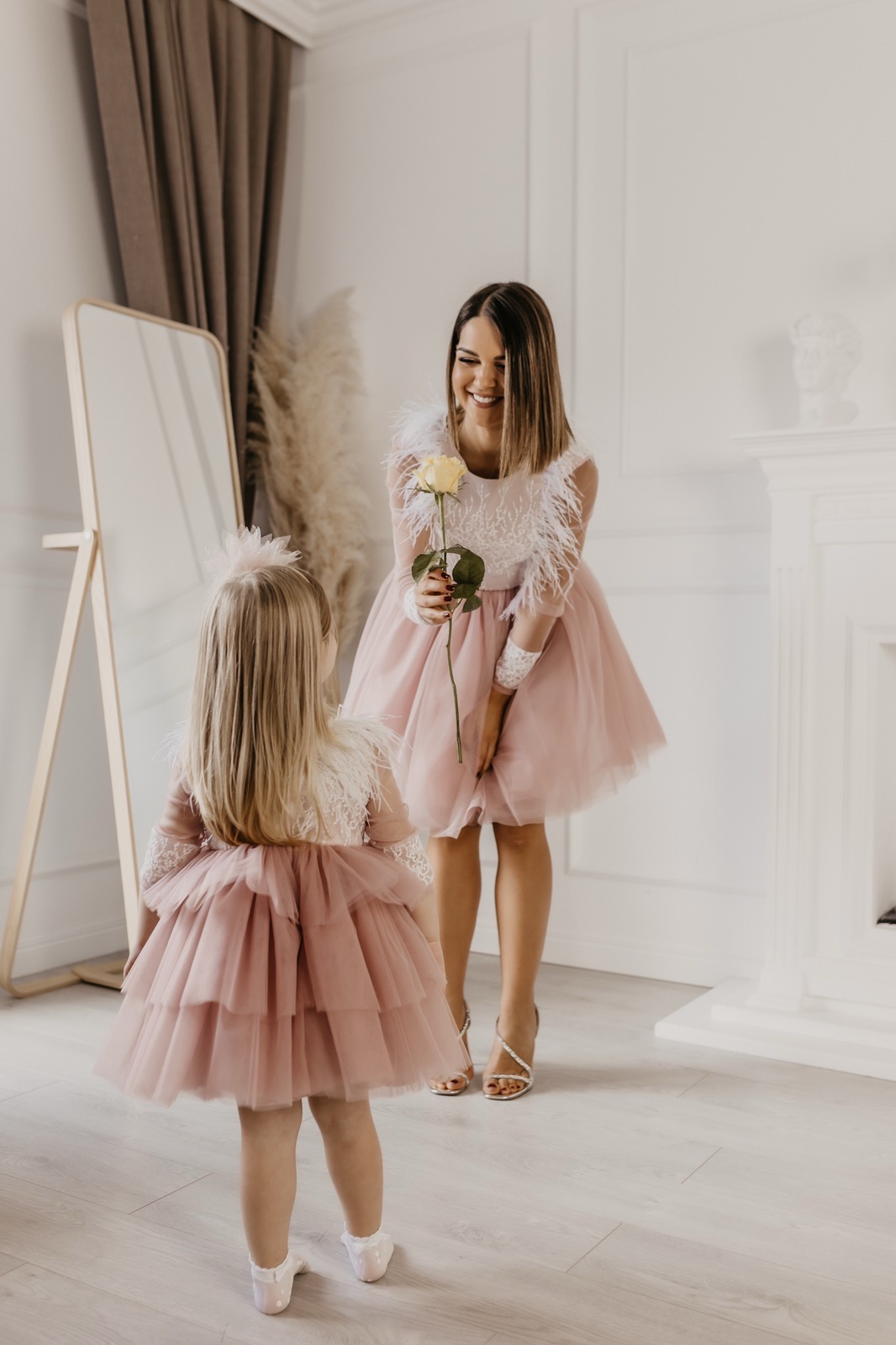 Detalj koji je “šlag” na ovoj roze torti su detalji na rukavima od prirodnog perja, koji daju poseban, glamurozan osećaj ovoj haljini. Devojčice obožavaju detalje od perja na haljinama, za njih ono čini svaku haljinu zabavnom i drugačijom.