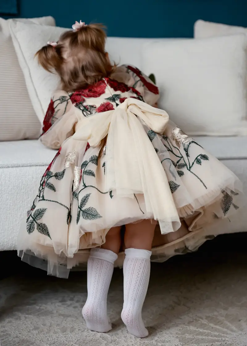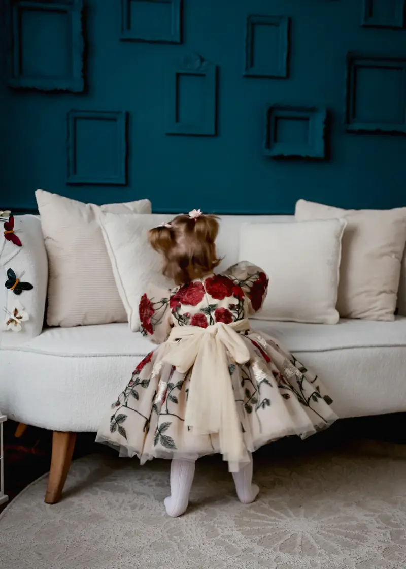 Ovaj model haljine dolazi u bež boji, koja asocira na formalni stil, zbog čega je idealan izbor za ovaj tip haljina. Ukrašena je prekrasnom vezenom čipkom vrhunskog kvaliteta, sa motivima crvenih i bež ruža. Ovaj motiv “razbacan” je po celoj haljini i njenim rukavima.