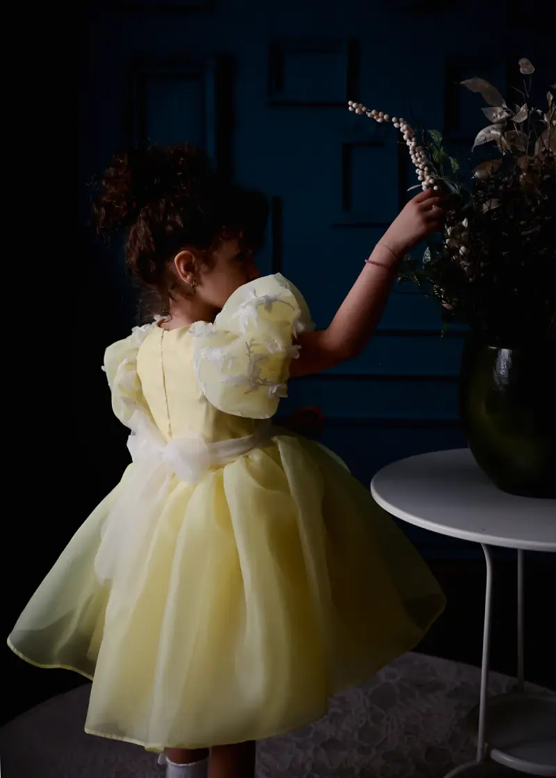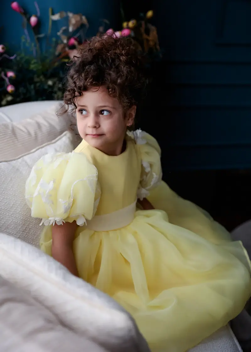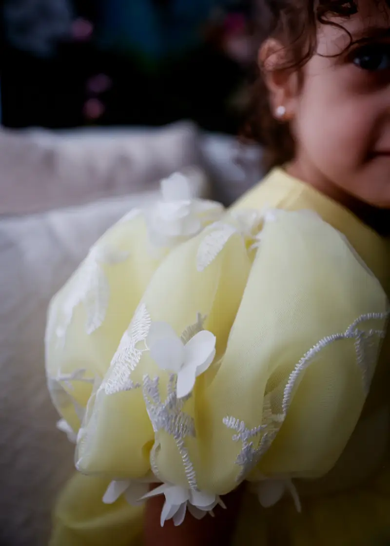 Ova haljina dolazi u zutoj ili beloj boji, u njenoj izradi smo koristili zanosni čipku i mnogo tila. Na rukavima se nalazi prekrasna 3dčipka. Zbog upotrebe kvalitetne 3D čipke, haljina izgleda kao da će leptirići poleteti sa nje, što decu oduševljava i rasplamsava njihovu maštu.