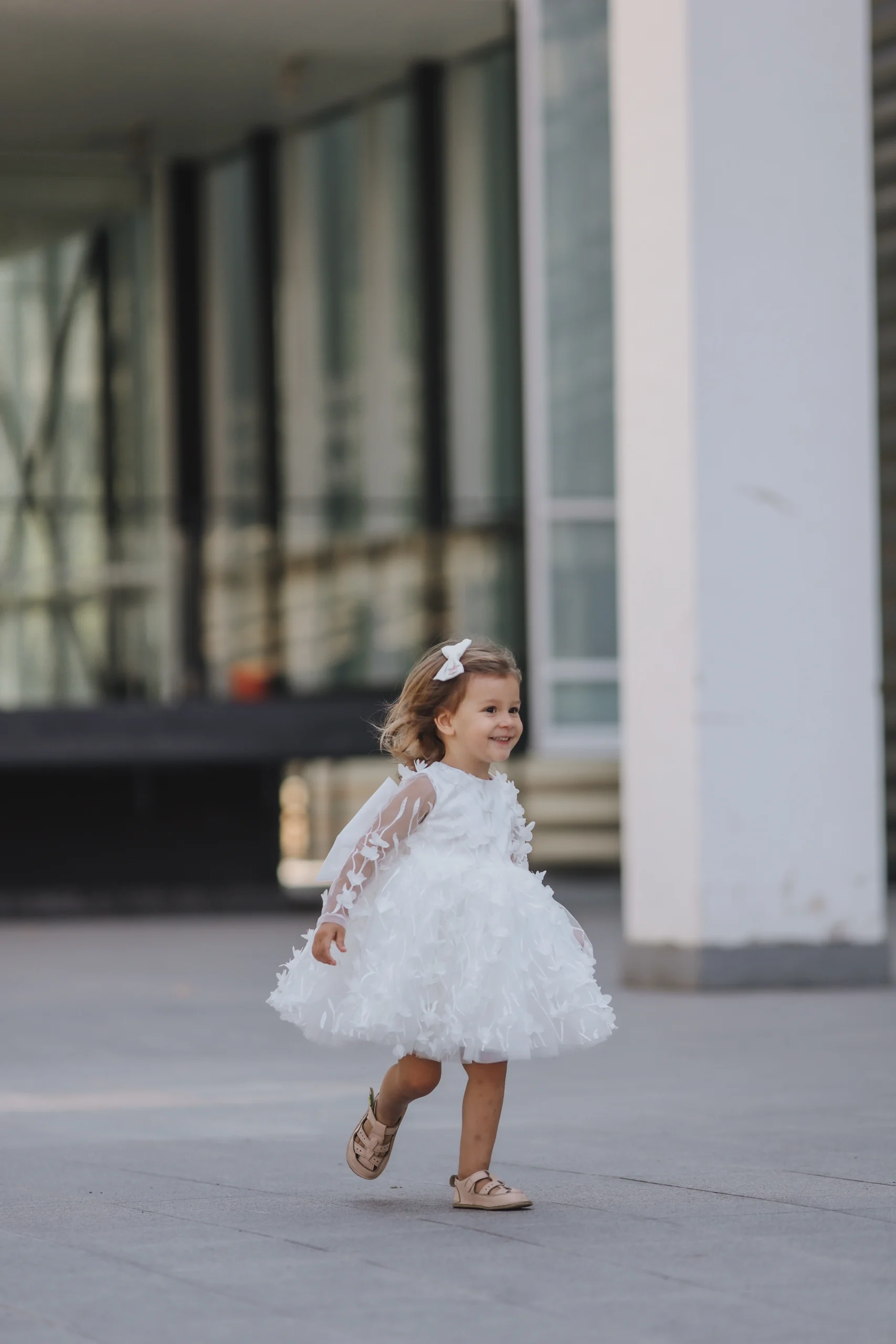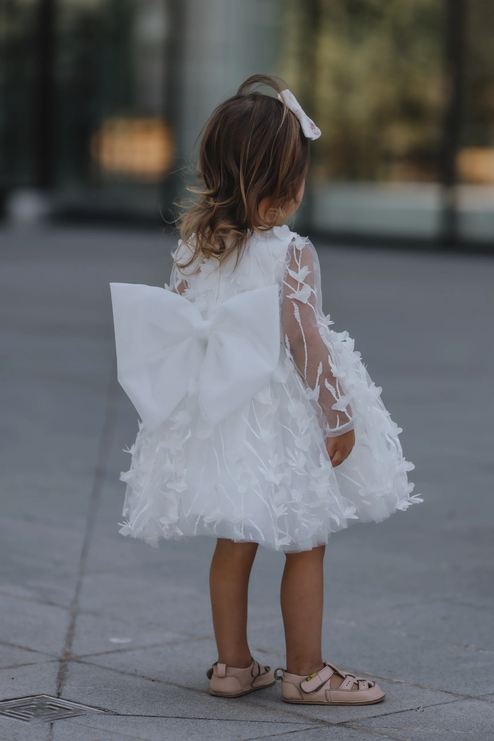 Ova elegantna haljina izrađena je od delikatnog tila ukrašenog 3D cvetnim aplikacijama, koje dodaju prefinjenost i romantičan izgled. Dugi rukavi od prozirnog tila sa cvetnim detaljima pružaju lagani i eterični osećaj, dok slojevita suknja daje volumen i stvara bajkovitu siluetu. Velika mašna na leđima čini haljinu još posebnijom i luksuznijom.