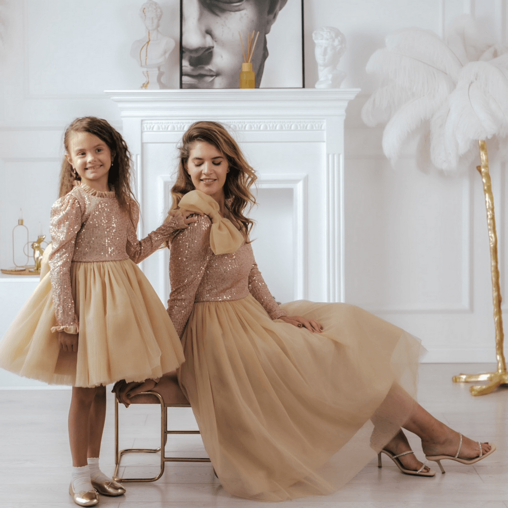 Elegantna zlatna haljina sa šljokicama i til suknjom, savršena za svadbe, proslave i večernje događaje.
