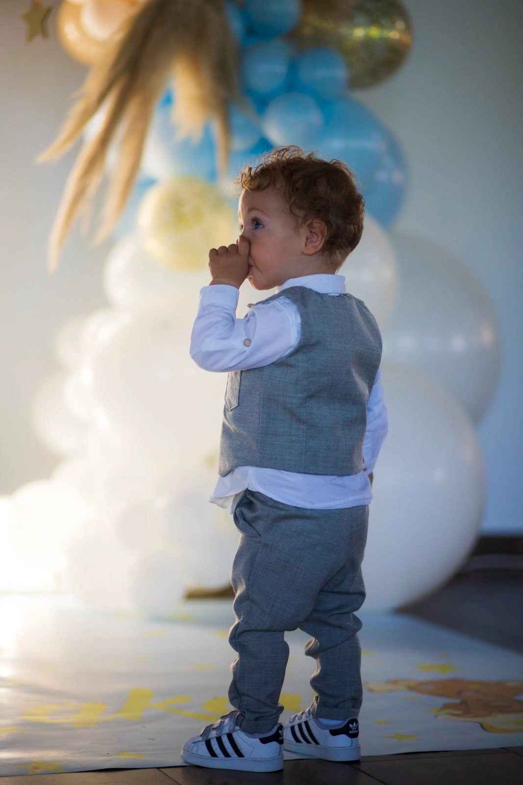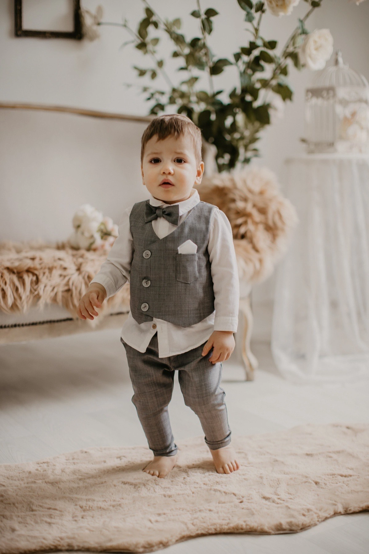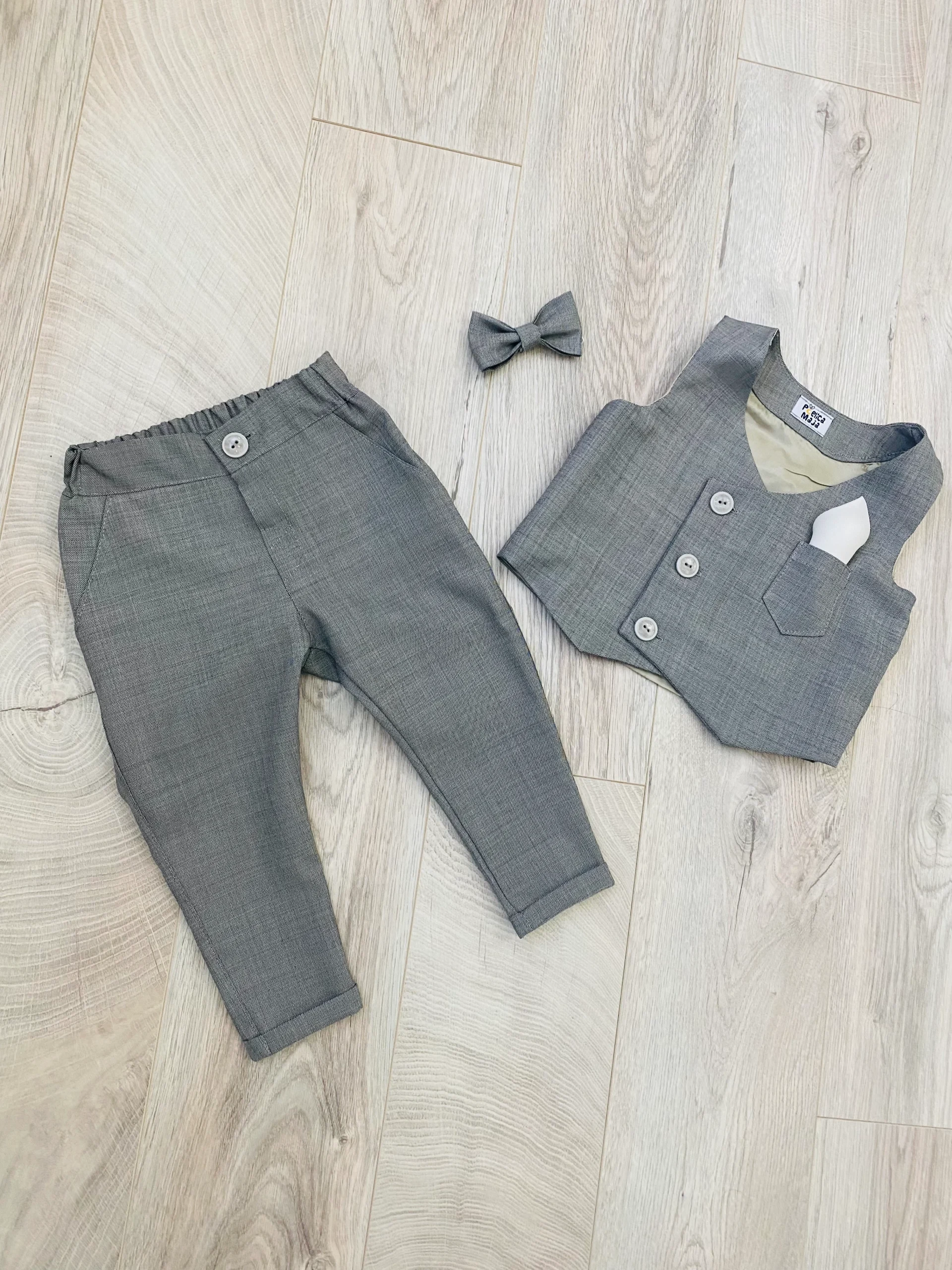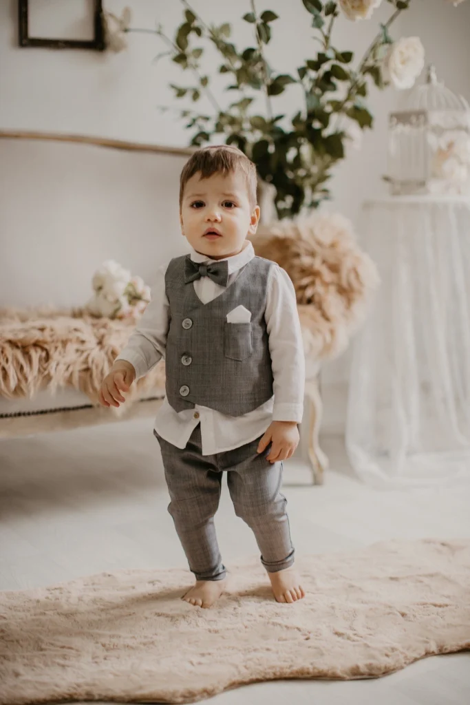 Odelo za dečake koje sadrži pantalone, prsluk i leptir mašnu odiše klasičnim i elegantnim stilom, savršenim za svečane prilike poput krštenja, venčanja ili rođendana.